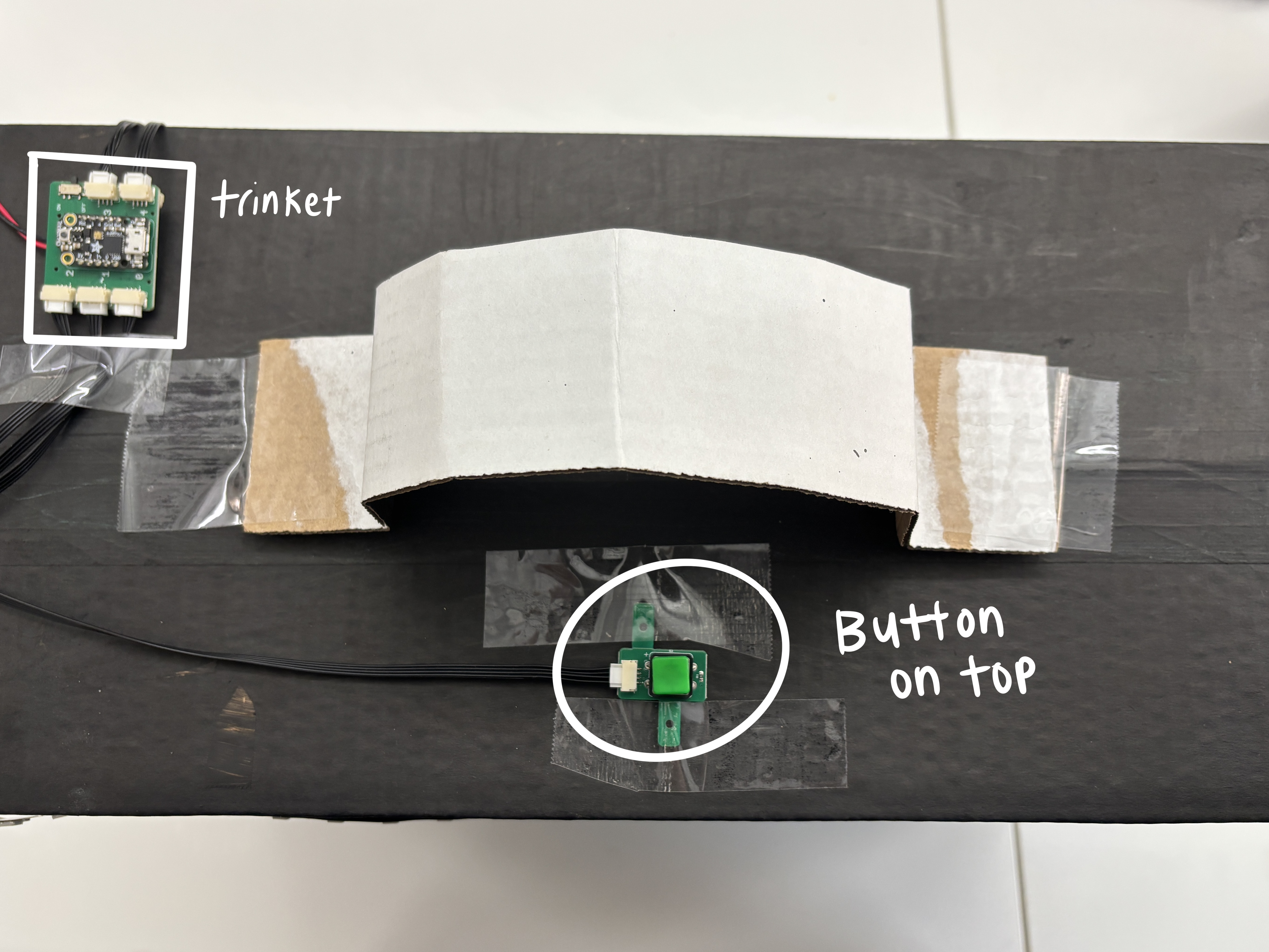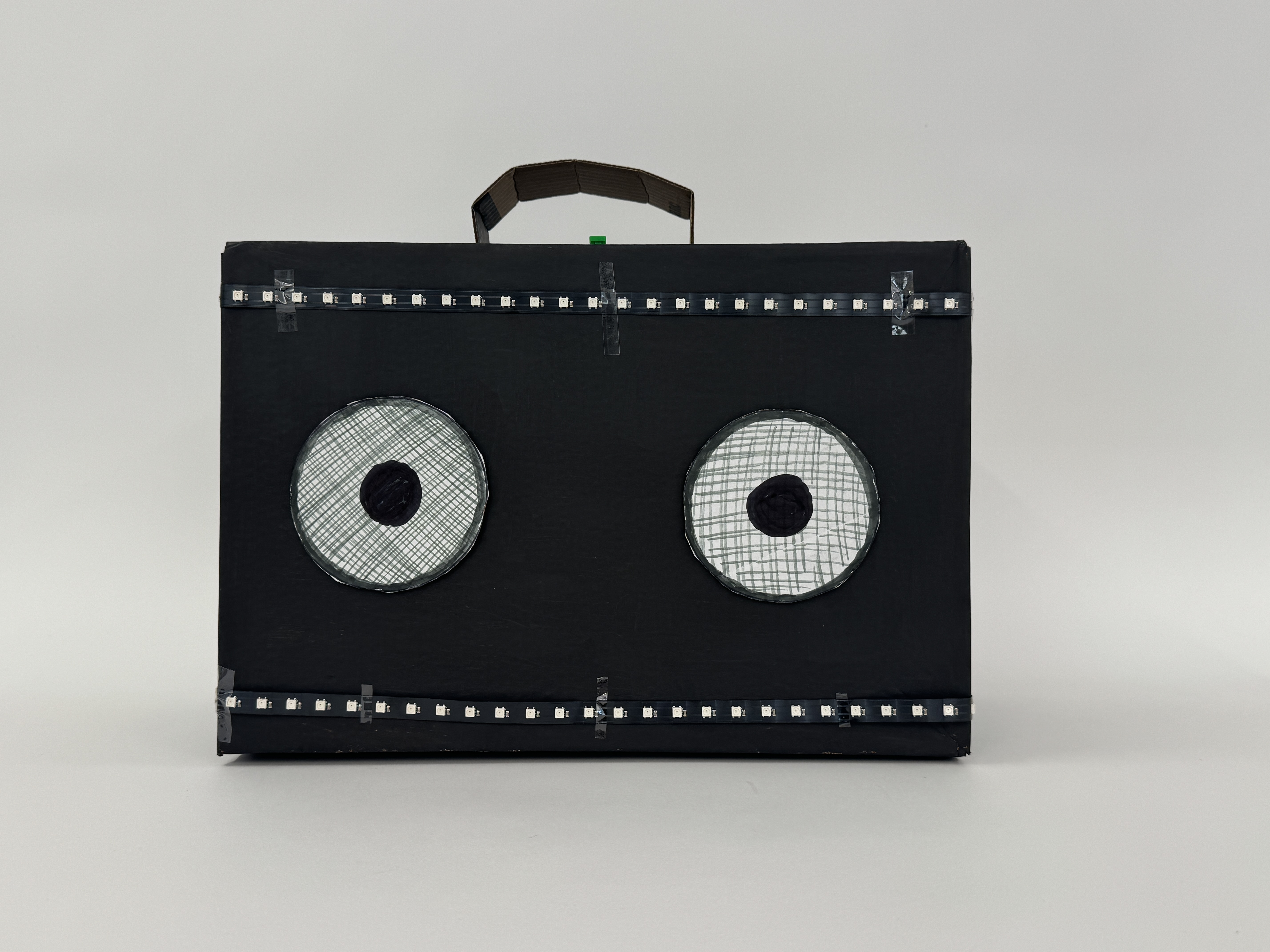 The dancers used a cardboard box as the base for their boombox. They secured the microcontroller to the top, and taped down the extenders to give them leeway to place the sensors and LEDs wherever they wanted.