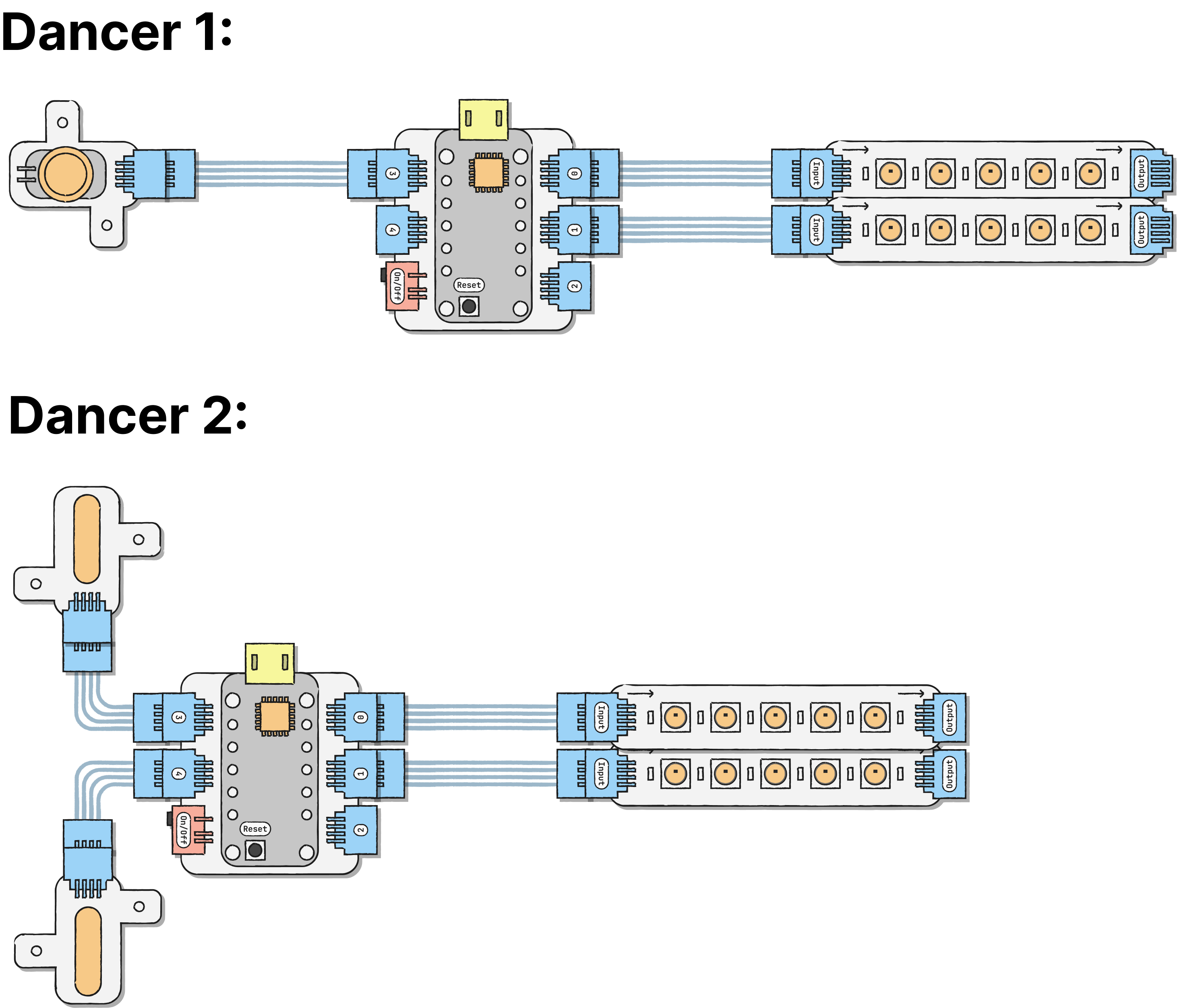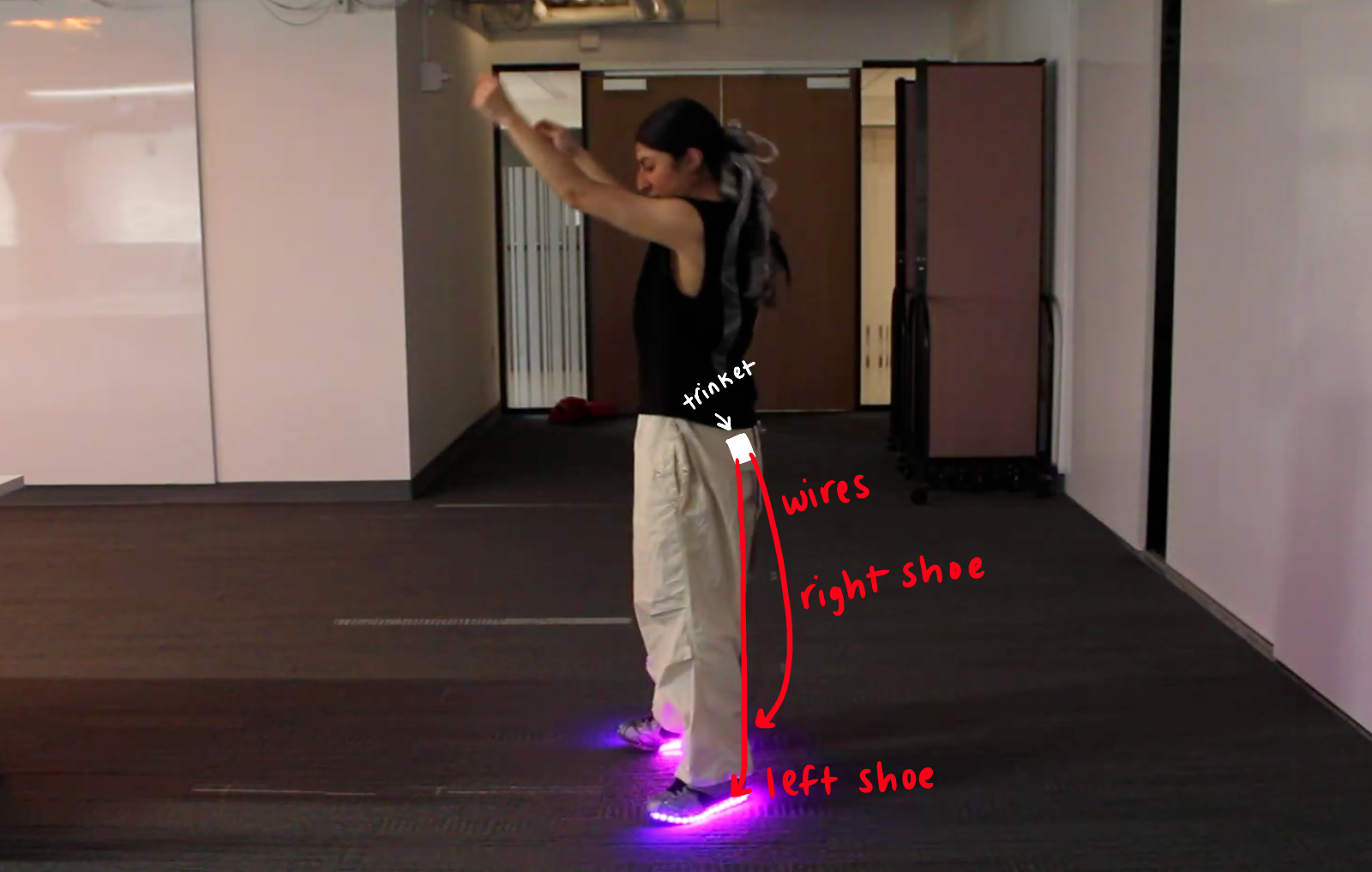 One dancer places the button on the inner part of one shoe. She runs the extenders along both sides of her legs and places the microcontroller in her pocket.