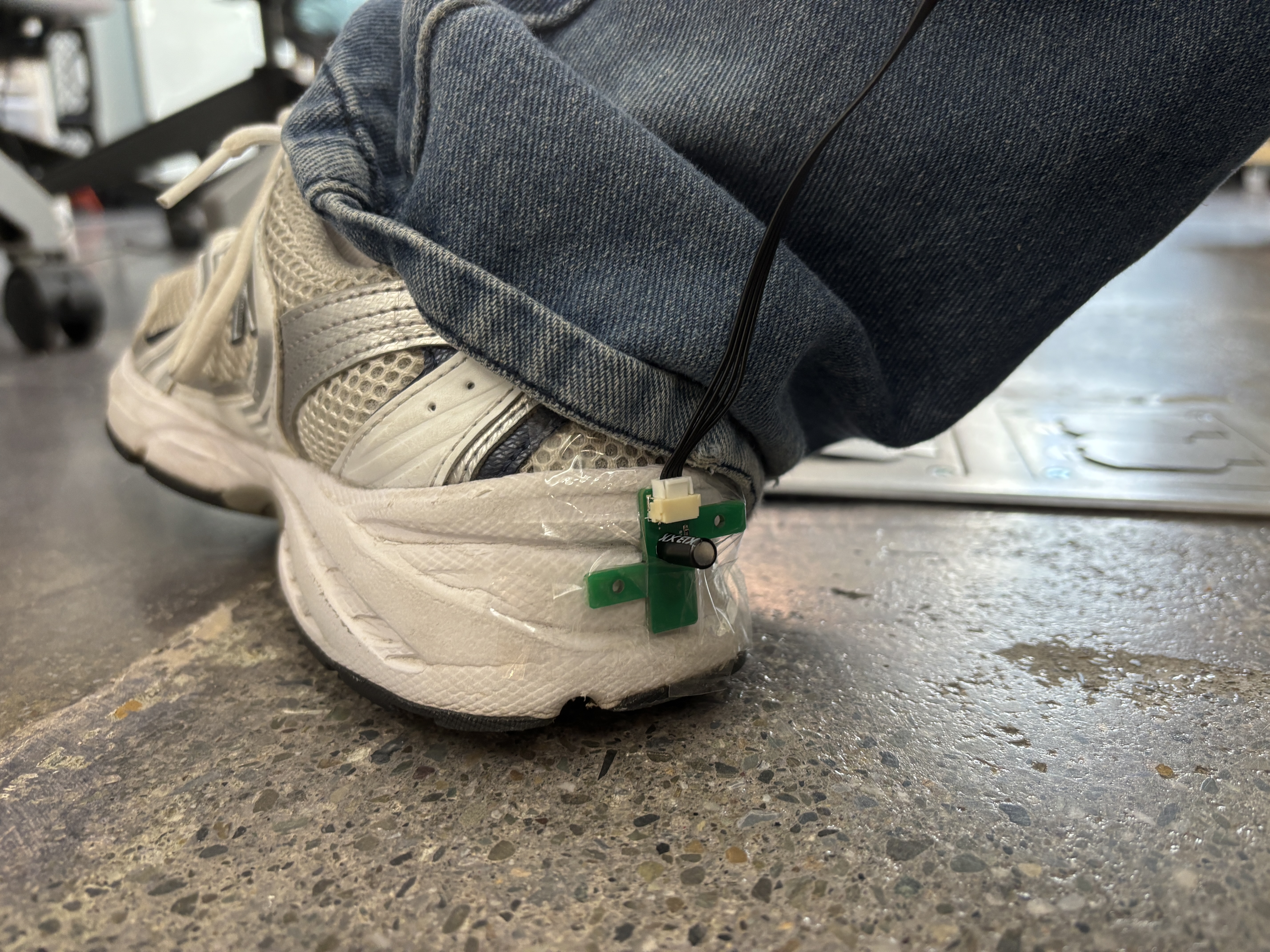 The second dancer places the tilt sensor on the back of her shoe, near her heel.