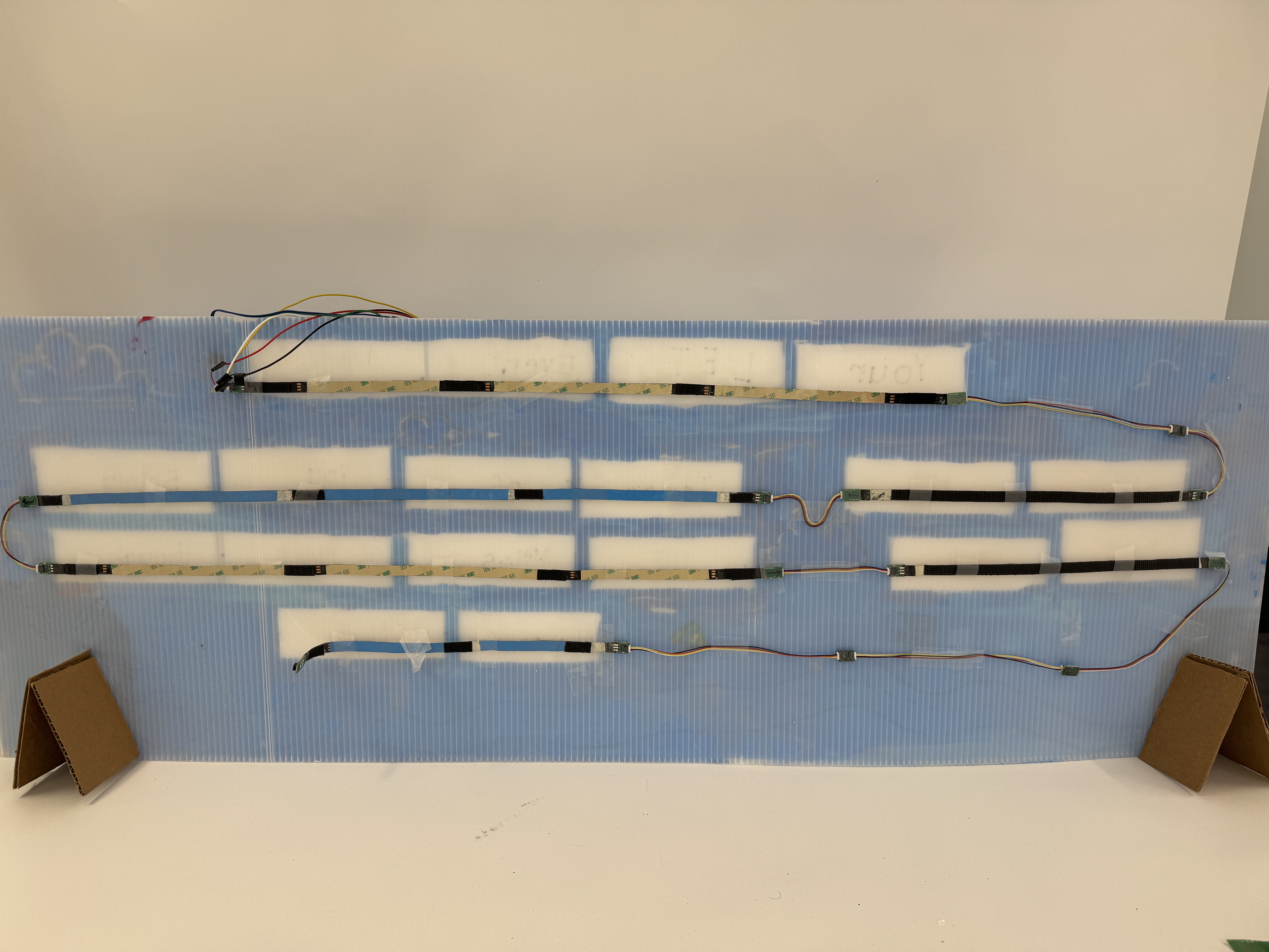 The LED strips are mounted on the back of the board using extenders, and the highlighted words are controlled by separating them into arrays, as seen in the code.