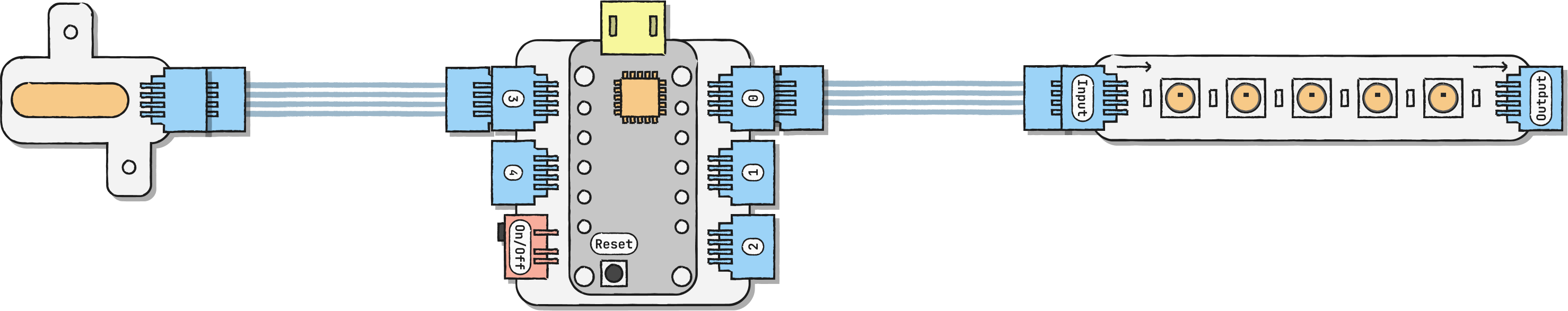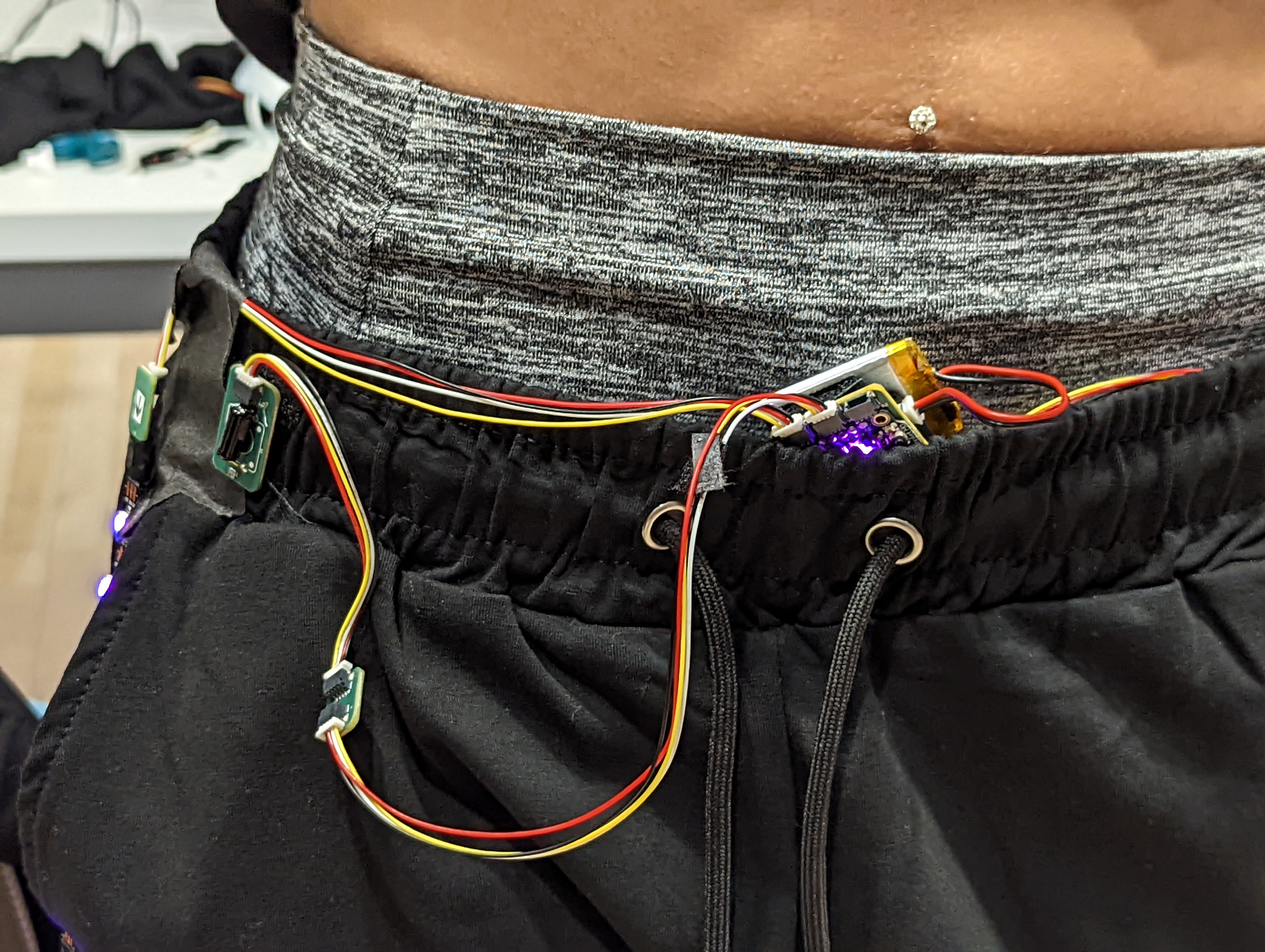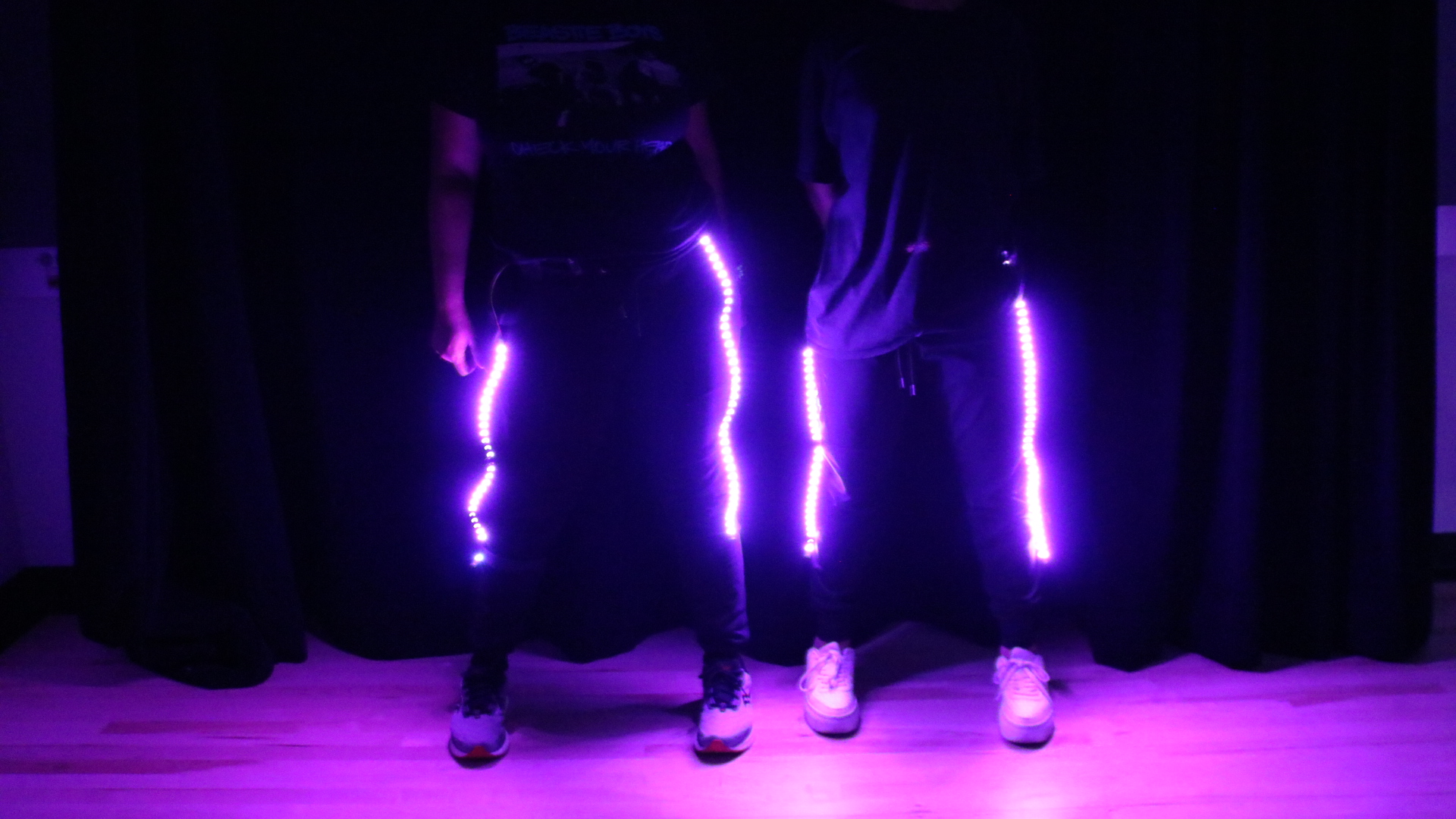 STEM From Dance instructors created a routine set to the song "Take Time" by Backroad Gee, which includes LED strips running down the sides of their pants. They use tilt sensors on their bodies to determine whether or not the LED strip is purple or green. Since the tilt sensor is on their hips, they rely on movements that require bending their knees to trigger the changes.