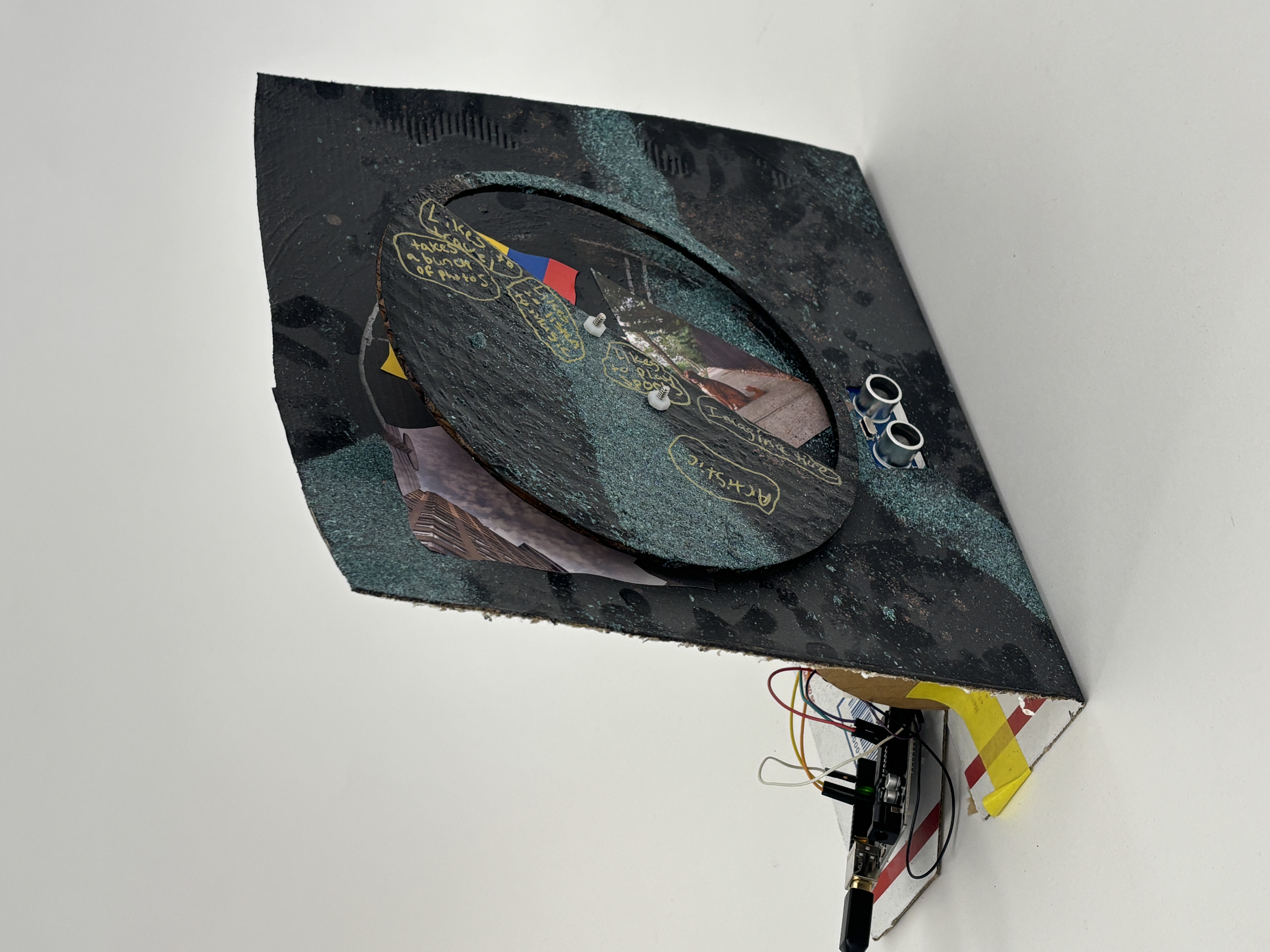 The “Turning Wheel of Closeness” features a rotating cardboard display that unveils images from the artist’s life. As an ultrasonic sensor detects varying distances, a servo motor activates to reveal additional pictures. The closer the viewer approaches, the more intimate the insights into the artist’s story become.
