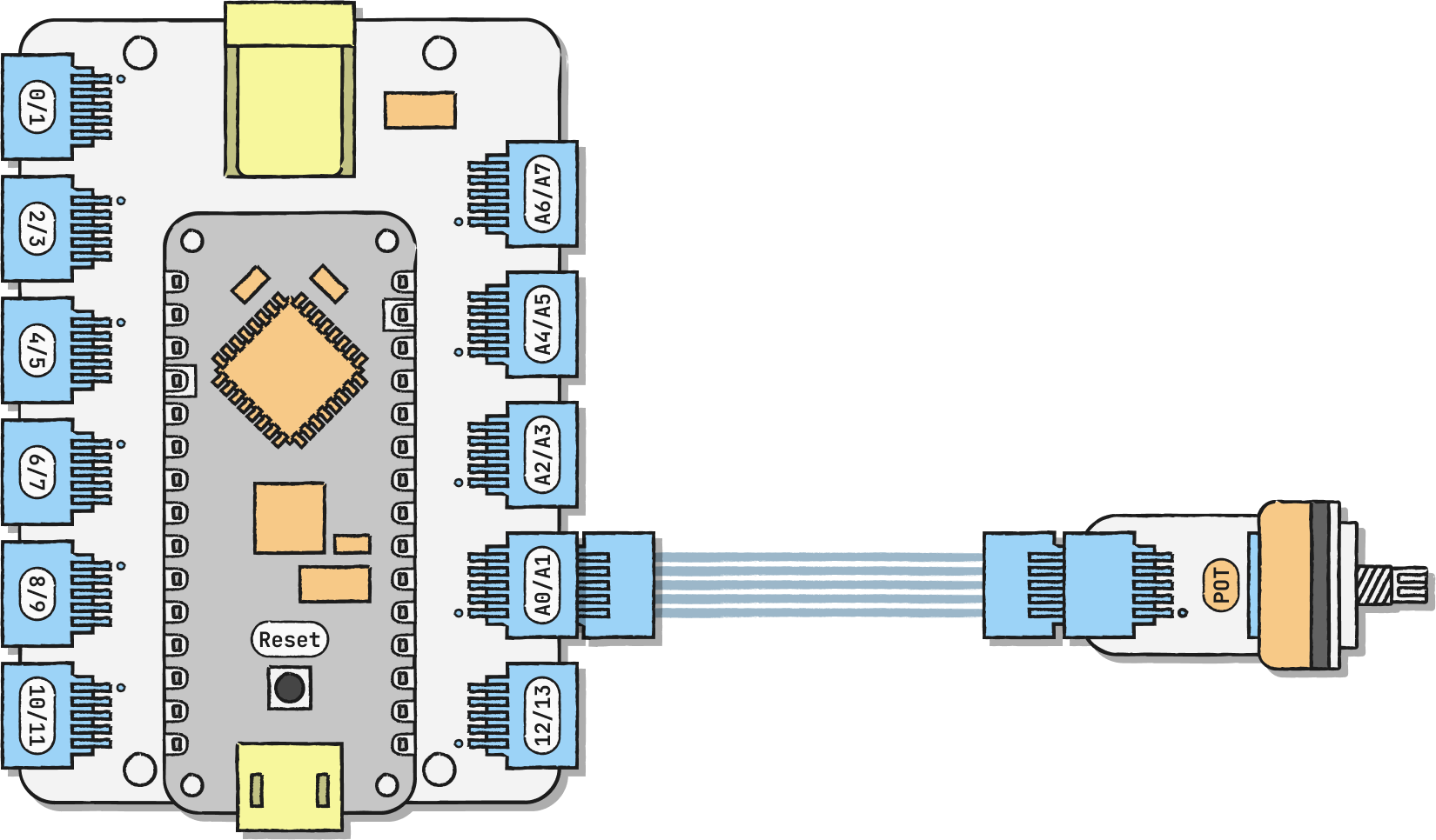 Connect the potentiometer to any analog pin (the ones that start with an A). In our example, we're using A0/A1. The analog pins have the ability to read a continuous range of values as opposed to digital pins that can only read 2 values, high or low (on or off).